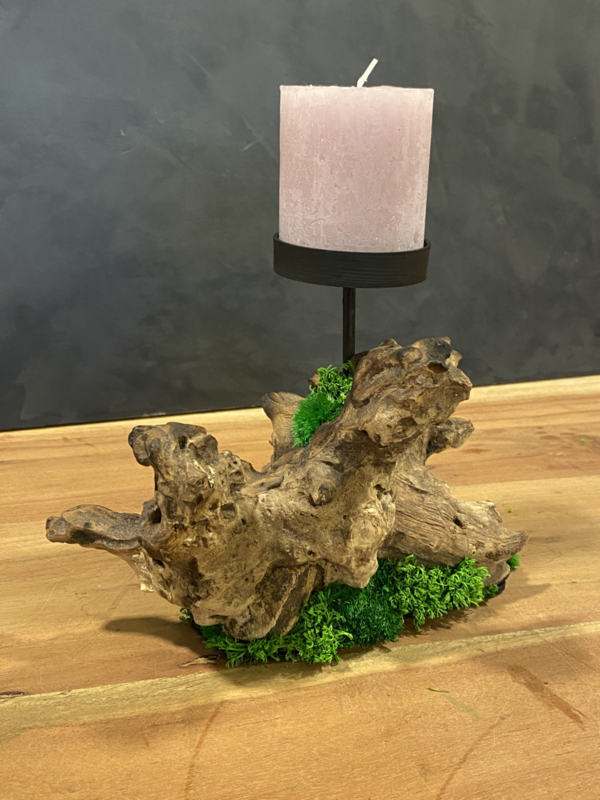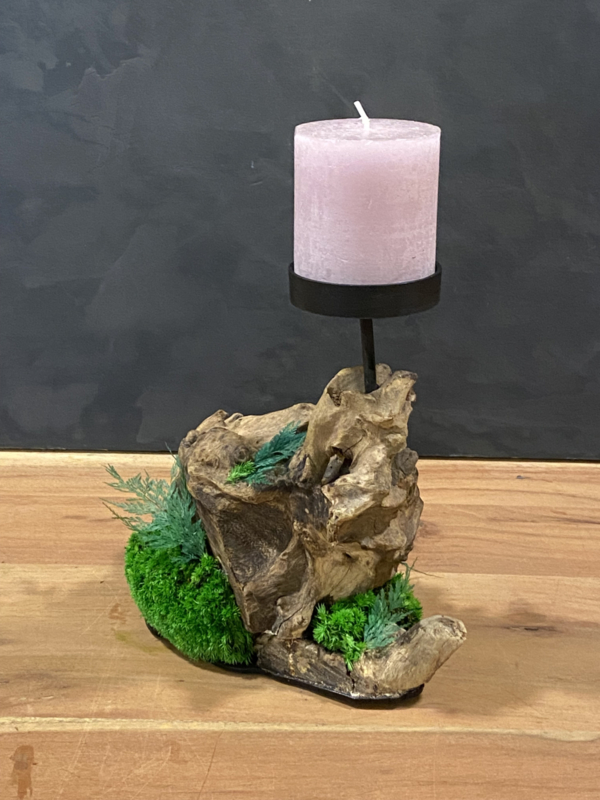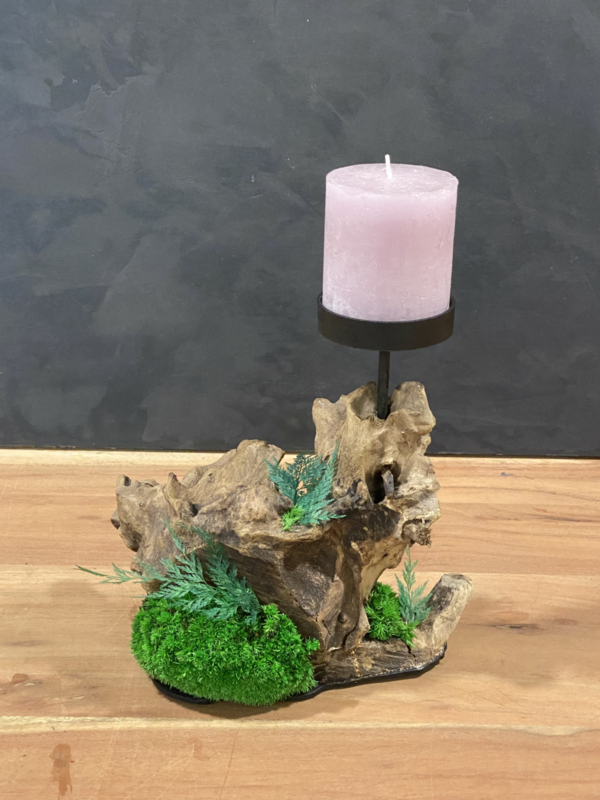 Breng sfeer en gezelligheid in huis met deze erosie houten kaarsenhouder uniek door zijn vorm gecombineerd met mooie mos soorten en geprepareerde varens.