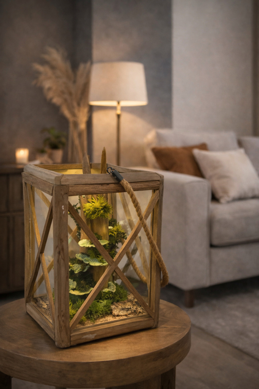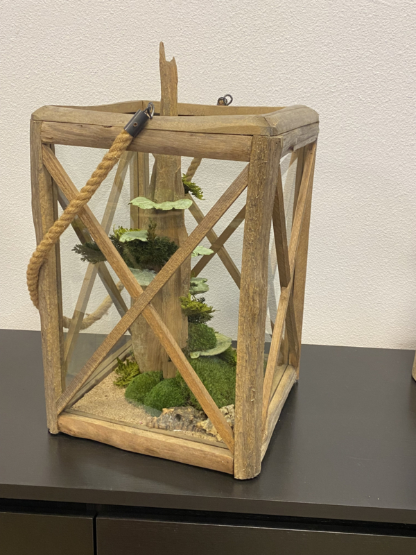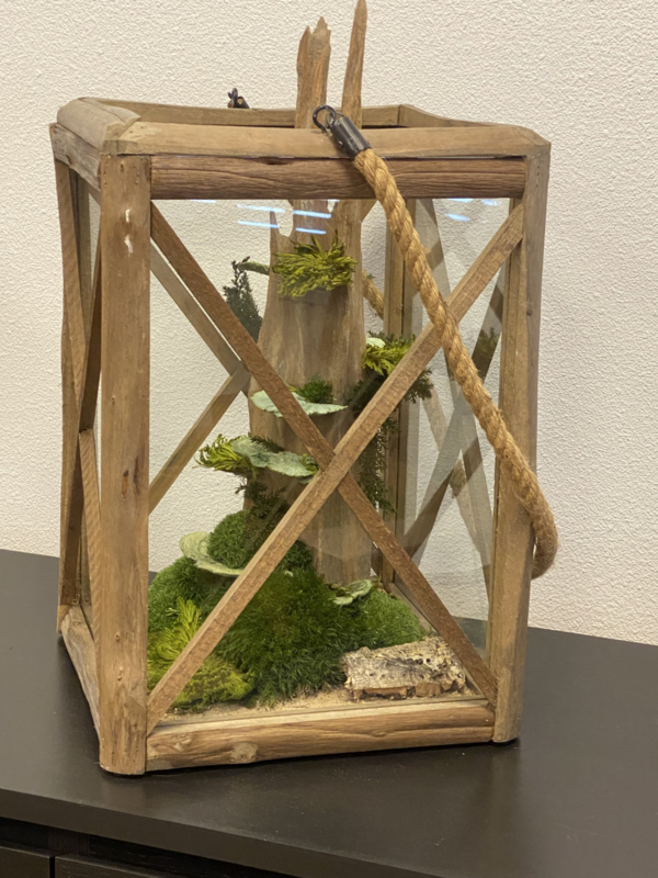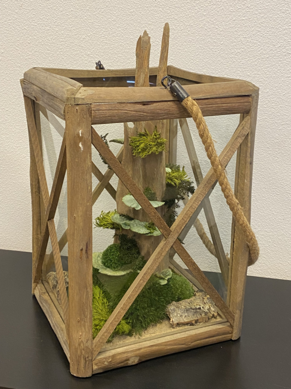 “Een uniek en sfeervol windlicht met karakter – deze blikvanger is opgebouwd op een hoge houten ‘rots’ die als stevige, organische basis dient. Rondom zijn zorgvuldig gekozen boomsponzen en diverse soorten decoratief mos verwerkt, waarmee een speels reliëf in hoogte is gecreëerd. Geprepareerde takken zijn met oog voor detail toegevoegd, wat zorgt voor een rijke, luxe uitstraling. Dit windlicht combineert natuurlijke elementen met stijlvol design en voegt warmte, sfeer en een vleugje bosmagie toe aan elk interieur.”