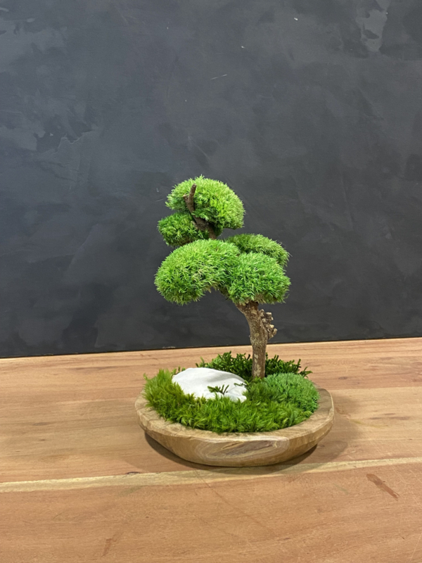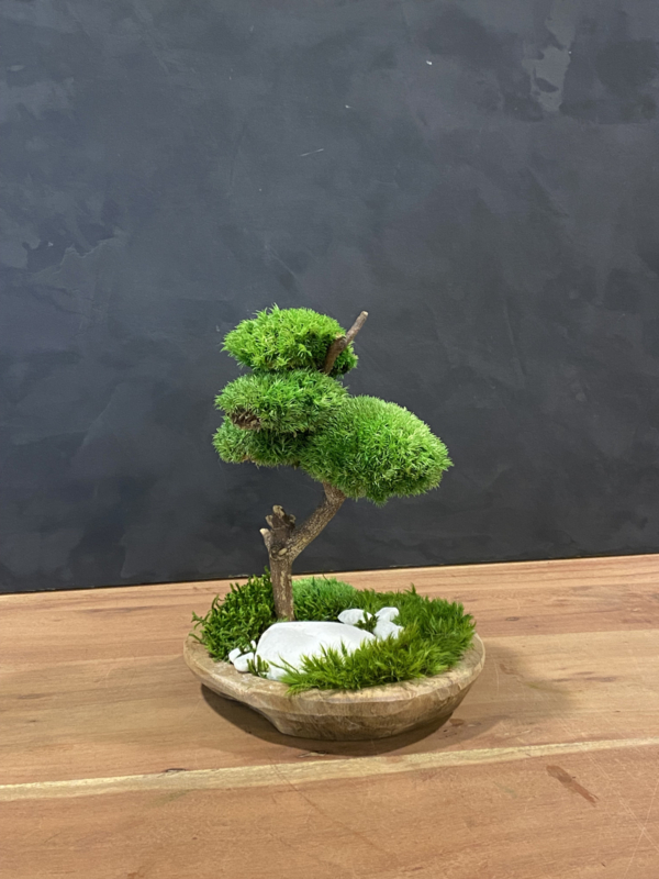 In de houten schaal staat een mooi geprepareerde boompjes, omringd door verschillende soorten mos. De combinatie van natuurlijke materialen zorgt voor een serene en sfeervolle uitstraling, ideaal voor elk interieur.