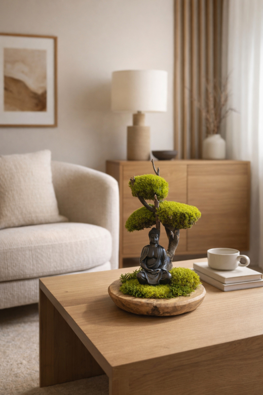 Mooi door zijn eenvoud – Een unieke houten schaal met bolmosboompje