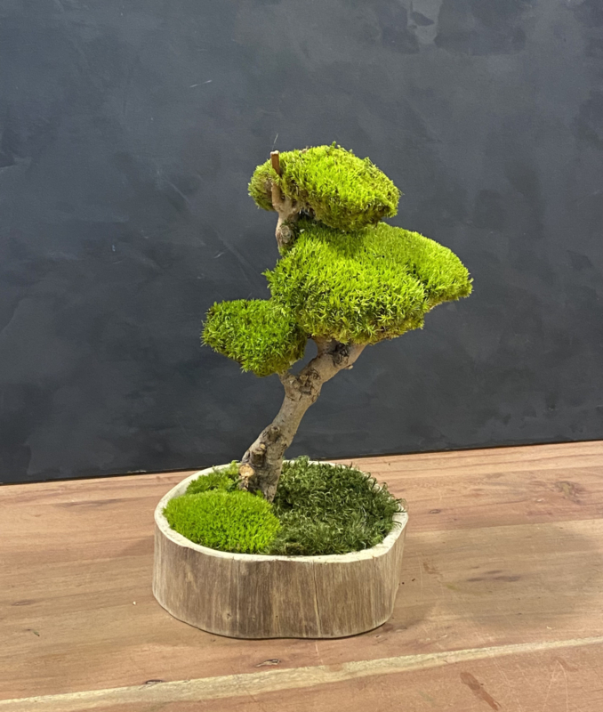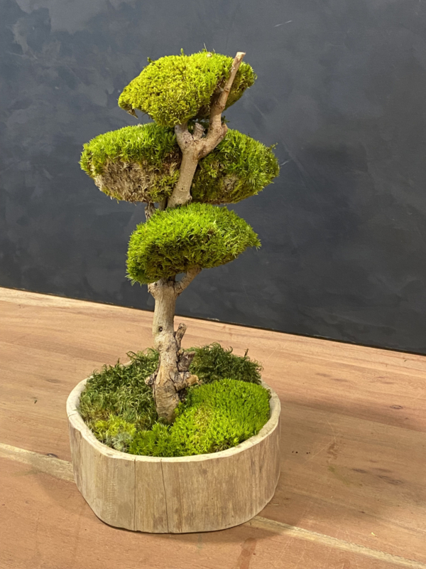 In de houten schaal staat een mooi geprepareerde boompjes, omringd door verschillende soorten mos. De combinatie van natuurlijke materialen zorgt voor een serene en sfeervolle uitstraling, ideaal voor elk interieur.