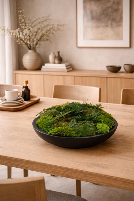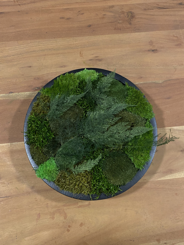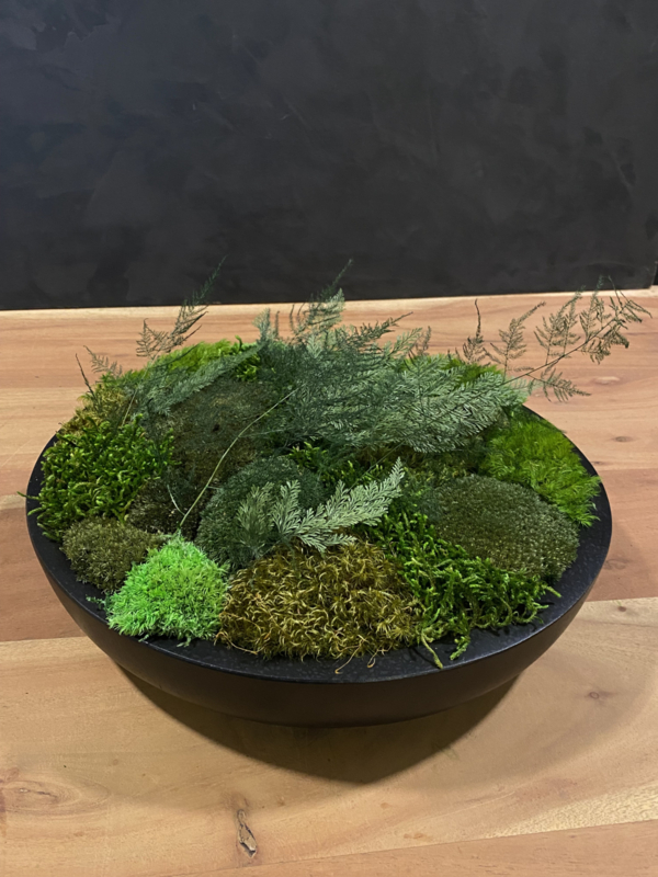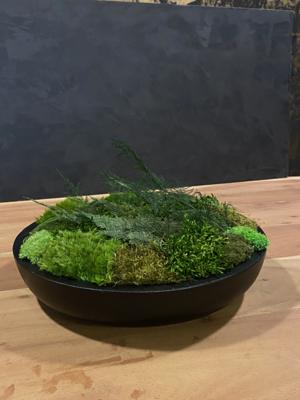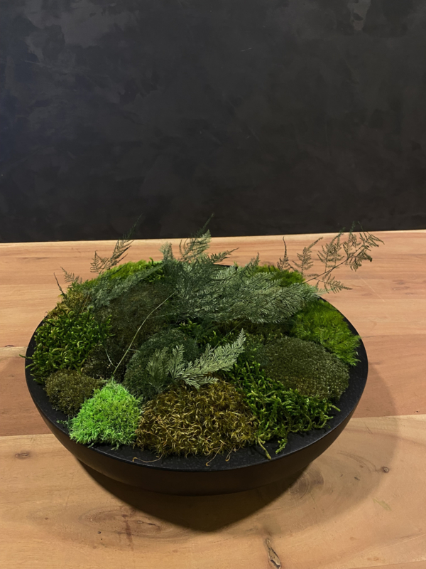 Deze stijlvolle zwart keramieken schaal is gevuld met zorgvuldig geprepareerde mossoorten in verschillende natuurlijke tinten groen, wat zorgt voor een rustgevende en luxe uitstraling. De combinatie van hoogwaardige materialen en natuurlijke elementen maakt dit arrangement tot een tijdloos decoratiestuk dat moeiteloos past binnen zowel moderne als klassieke interieurs.