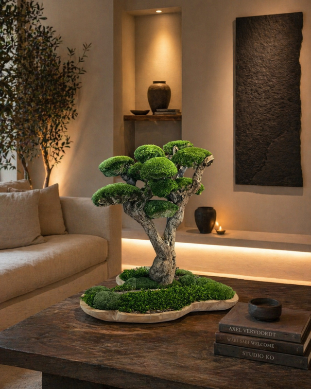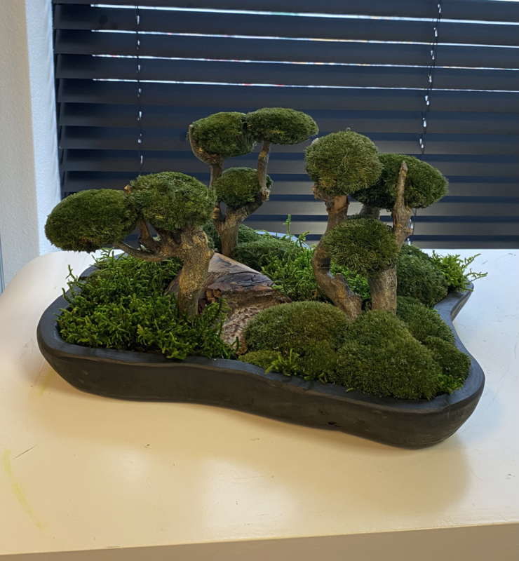 Organische schaal met mos boompjeBreng de rust en schoonheid van de natuur in huis met deze unieke decoratieve opstelling.