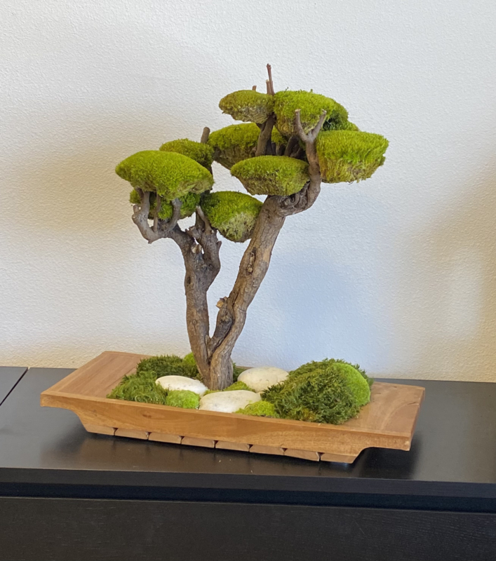 Naturel houten schaal met mosboompje (1.4)Breng de rust en schoonheid van de natuur in huis met deze unieke decoratieve opstelling.