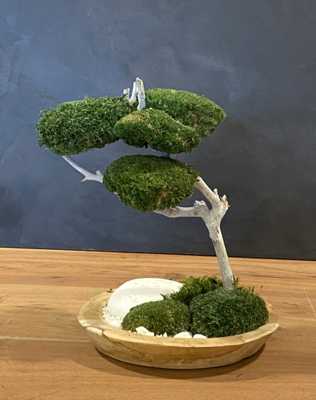 Houten schaal met mosboom (2)Breng de rust en schoonheid in huis met deze unieke moscreatie.