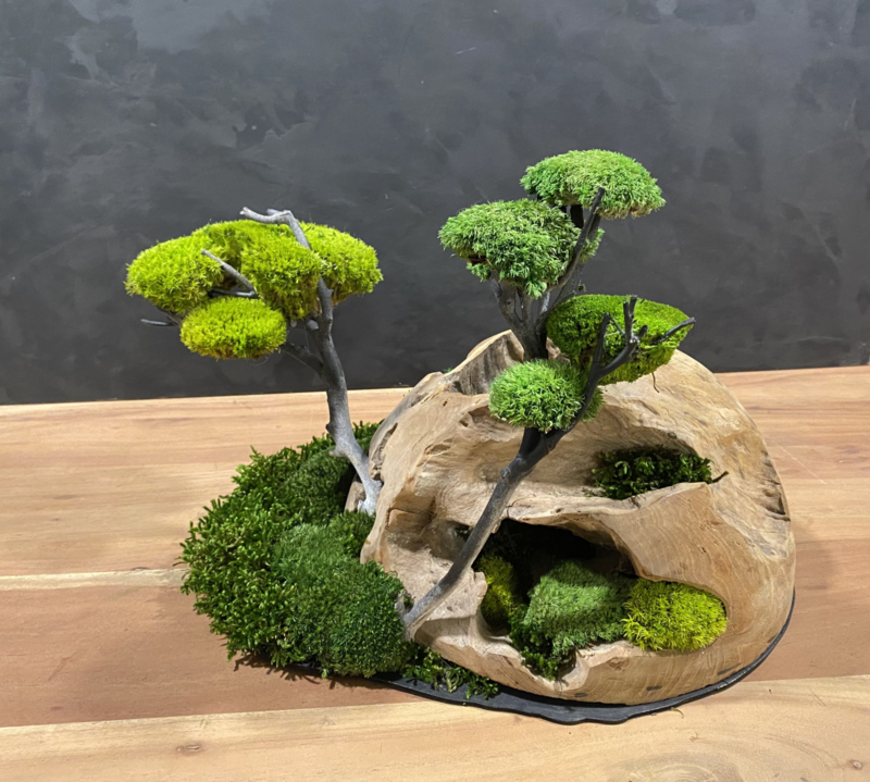 Organisch gevormde houten schaal met mos boompje (1)Mooi door zijn eenvoud deze houten schaal met bolmosboompje.