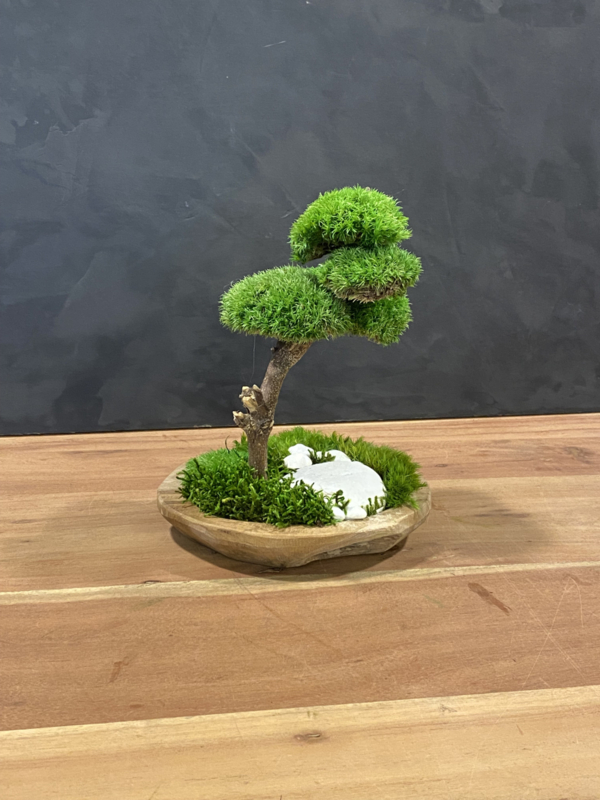 Naturel houten schaal met mosboompje (1.3)Breng de rust en schoonheid van de natuur in huis met deze unieke decoratieve opstelling.