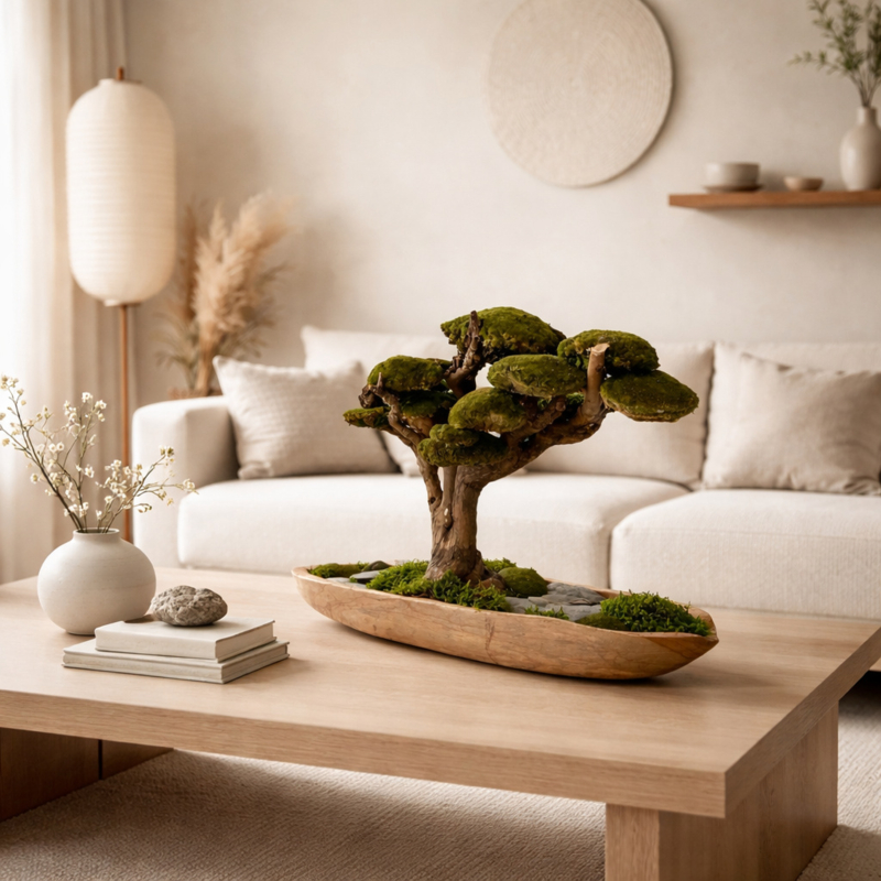 Breng rust, sfeer en natuurlijke elegantie in huis met deze met zorg samengestelde houten schaal met bolmosboompje.