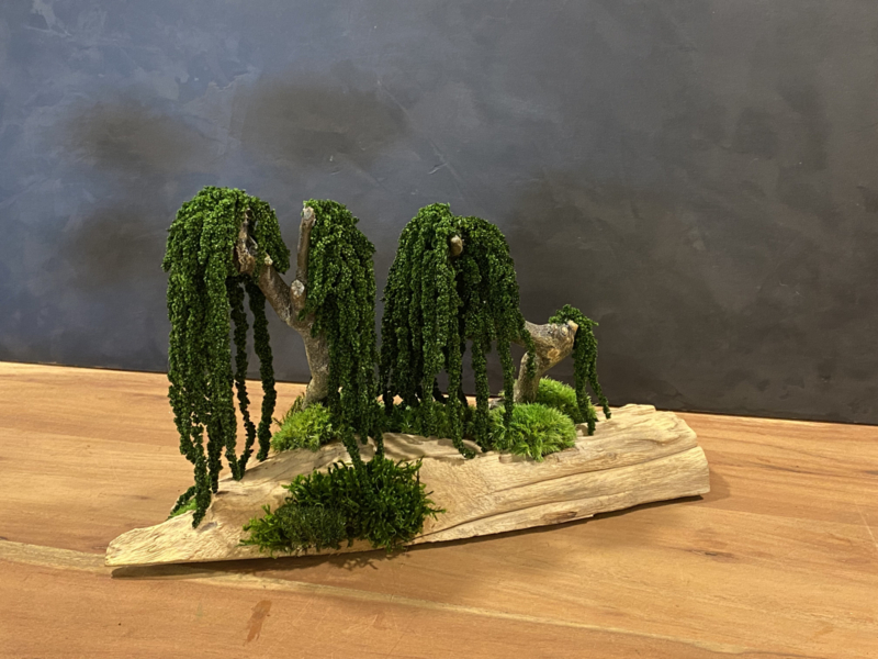 Centraal is het elegante boompje welke met 3 mooie bolmossen, die op de robuuste tak geplaatst zijn.